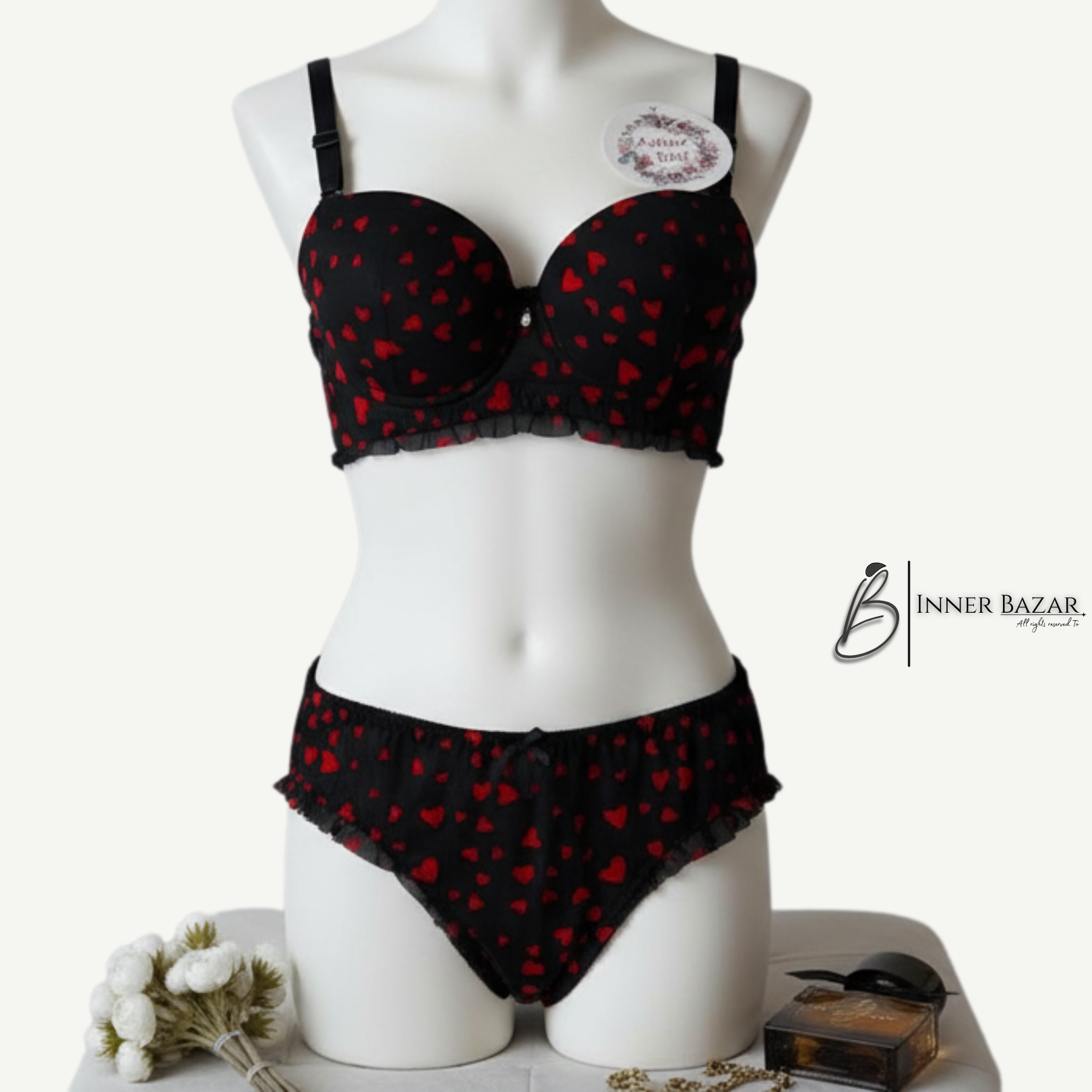 Heart Print Lace Bra & Panty Set – Black & White Romantic Lingerie for Women