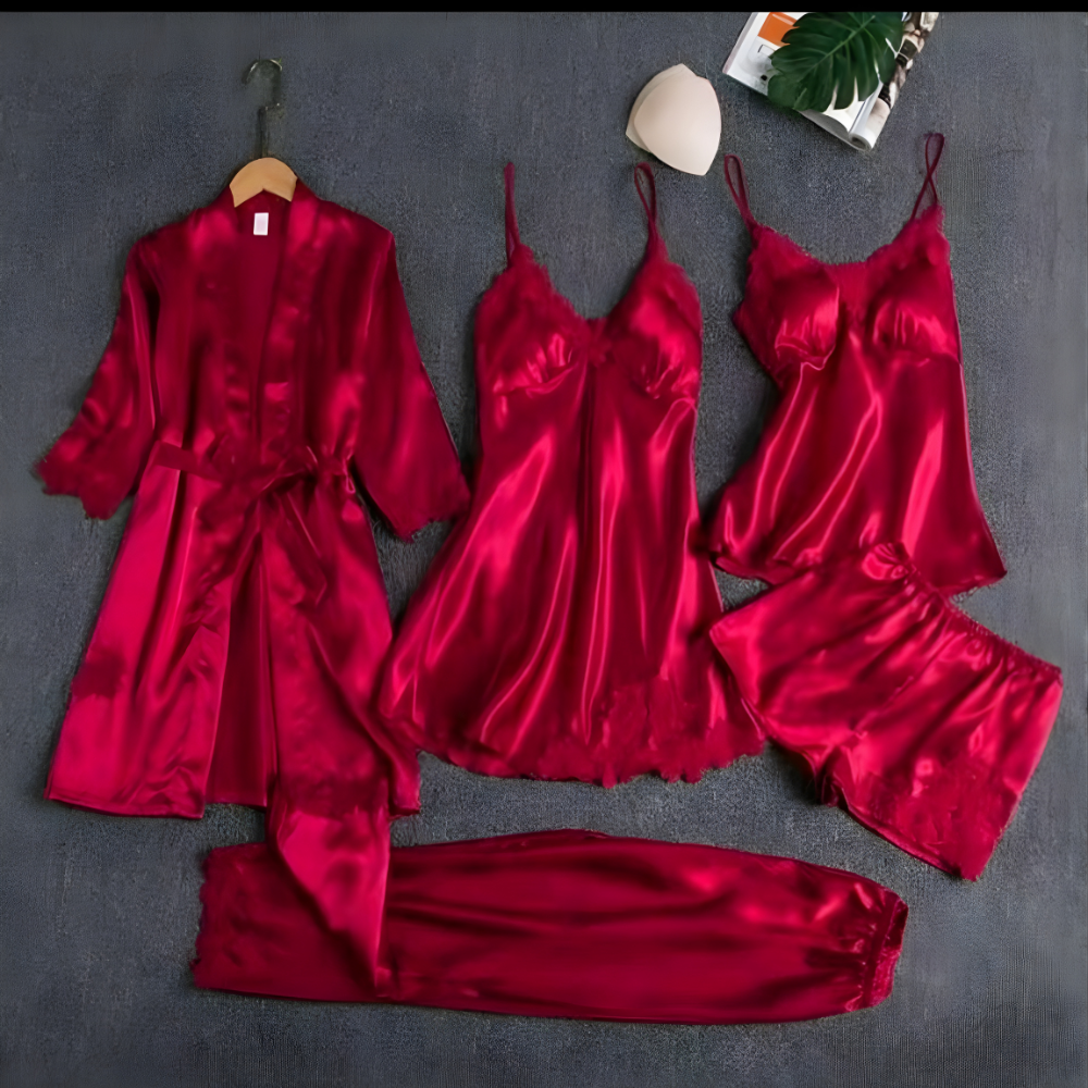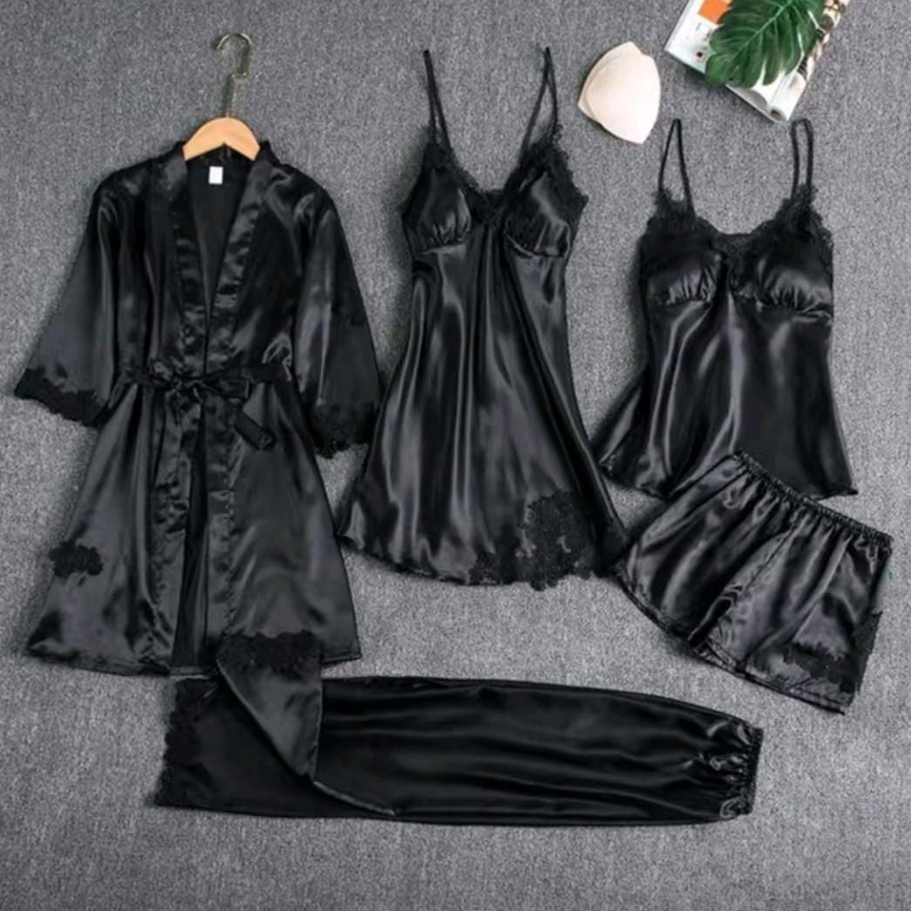 Experience the ultimate in bedtime luxury. This versatile 5-piece set includes everything you need for a stylish night in: a lace-trimmed nightdress, a delicate cami top with matching shorts, a full-length pair of trousers, and a graceful tie-waist robe. Crafted from silky-smooth satin with exquisite lace accents, it’s the perfect Lingerie set for yourself or a loved one.